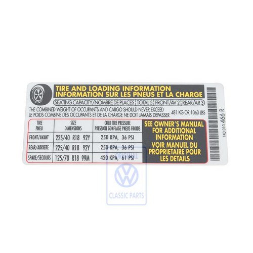 Data plate for tyre pressure. For Volkswagen Golf Mk6.