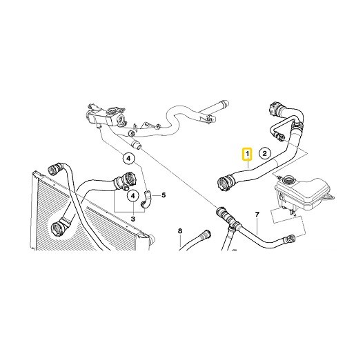 Coolant hose located between upper left radiator and cylinder head manifold (including intermediate connection to expansion tank) for BMW 5 Series E60, E60LCI berline and E61, E61LCI Touring with manual or automatic transmission :