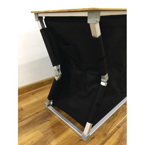 Descubra la comodidad de una cocina ordenada en el exterior de su autocaravana o caravana con este atractivo y funcional mueble de cocina. La cocina de camping BAMBOO QUICK MINI es justo lo que necesita. Listo para usar en pocos segundos gracias al práctico sistema de montaje rápido. Cuenta con una encimera de bambú, una ligera estructura de aluminio, un resistente revestimiento de poliéster Oxford y estantes fabricados con duraderos paneles de MDF . Hay espacio de sobra bajo el toldo o la persiana.