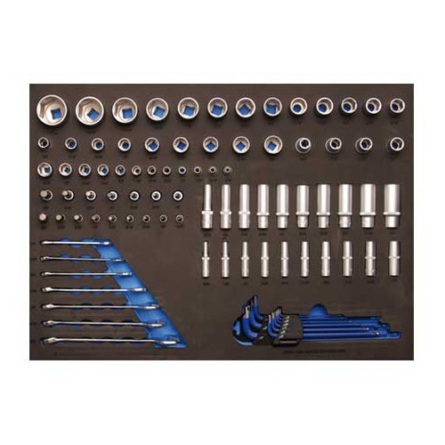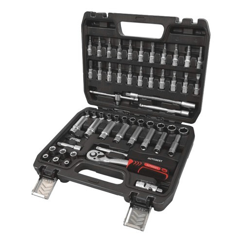 - 13 douilles, Super Lock : 4 - 4,5 - 5 - 5,5 - 6 - 7 - 8 - 9 - 10 - 11 - 12 - 13 - 14 mm- 8 douilles, Super Lock, longues : 6 - 7 - 8 - 9 - 10 - 11 - 12 - 13 mm- 1 cliquet réversible, fin 72 dents- 2 barres d'extension, 50 et 100 mm- 1 joint universel- 1 adaptateur hexagonal extérieur x carré extérieur 6,3 mm (1/4")- 1 barre d'extension flexible, 140 mm- 1 poignée coulissante 110 mm- 1 poignée tournante 150 mm- Douilles 3 embouts, fente SL 4 - 5,5 - 7 mm, longueur 38 mm- Douilles 2 embouts cruciformes PH1 - PH2, longueur 38 mm- Douilles 2 embouts cruciformes PZ1 - PZ2, longueur 38 mm- 4 douilles à embouts, six pans creux 3 - 4 - 5 - 6 mm, longueur 38 mm- Douilles 6 embouts, T-Star (pour Torx) T8 - T10 - T15 - T20 - T25 - T30, longueur 38 mm