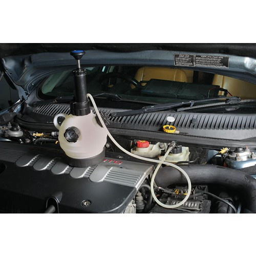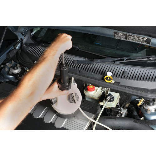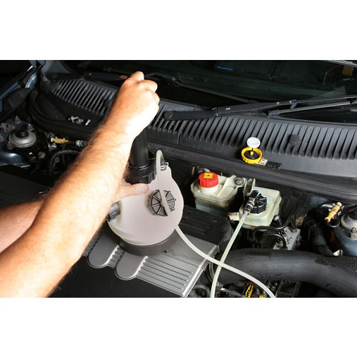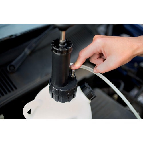 Une fois ce purgeur raccordé, remplissez la bombonne de liquide et mettez sous pression le circuit en pompant. Vous pouvez alors effectuer la purge sans aide extérieure.