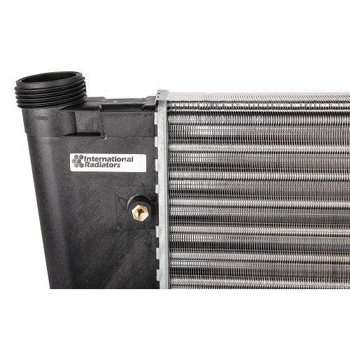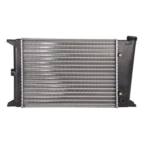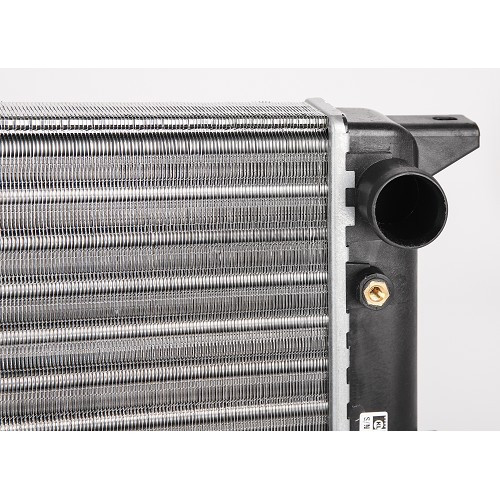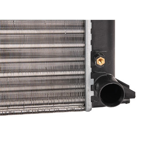 Radiatore con tappo lato conducente e raccordi dei manicotti dell'acqua lato passeggero. Dimensioni: 430 x 320 x 34 mm