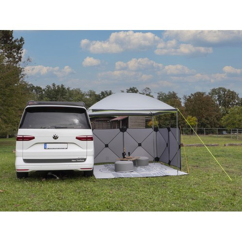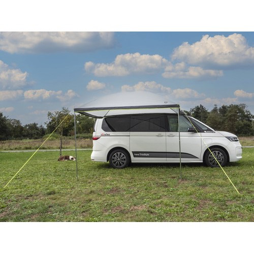 La tenda da sole per furgoni PALM BEACH 3.0 vi offre uno spazio abitativo supplementare. Il suo telaio diagonale in fibra di vetro forma una cupola di tessuto che impedisce la formazione di sacche d'acqua. È dotata di un doppio anello di fissaggio di 5 e 8 mm di diametro. L'installazione è facile e veloce.