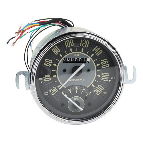 Este magnífico medidor CRONOMAC incorpora um medidor de combustível no mesmo mostrador, e encaixa para VW Beetle 1200/1300 e Combi Split com um diâmetro de 110mm irá adicionar o toque final ao seu Cox ou Combi (alemão ou brasileiro).